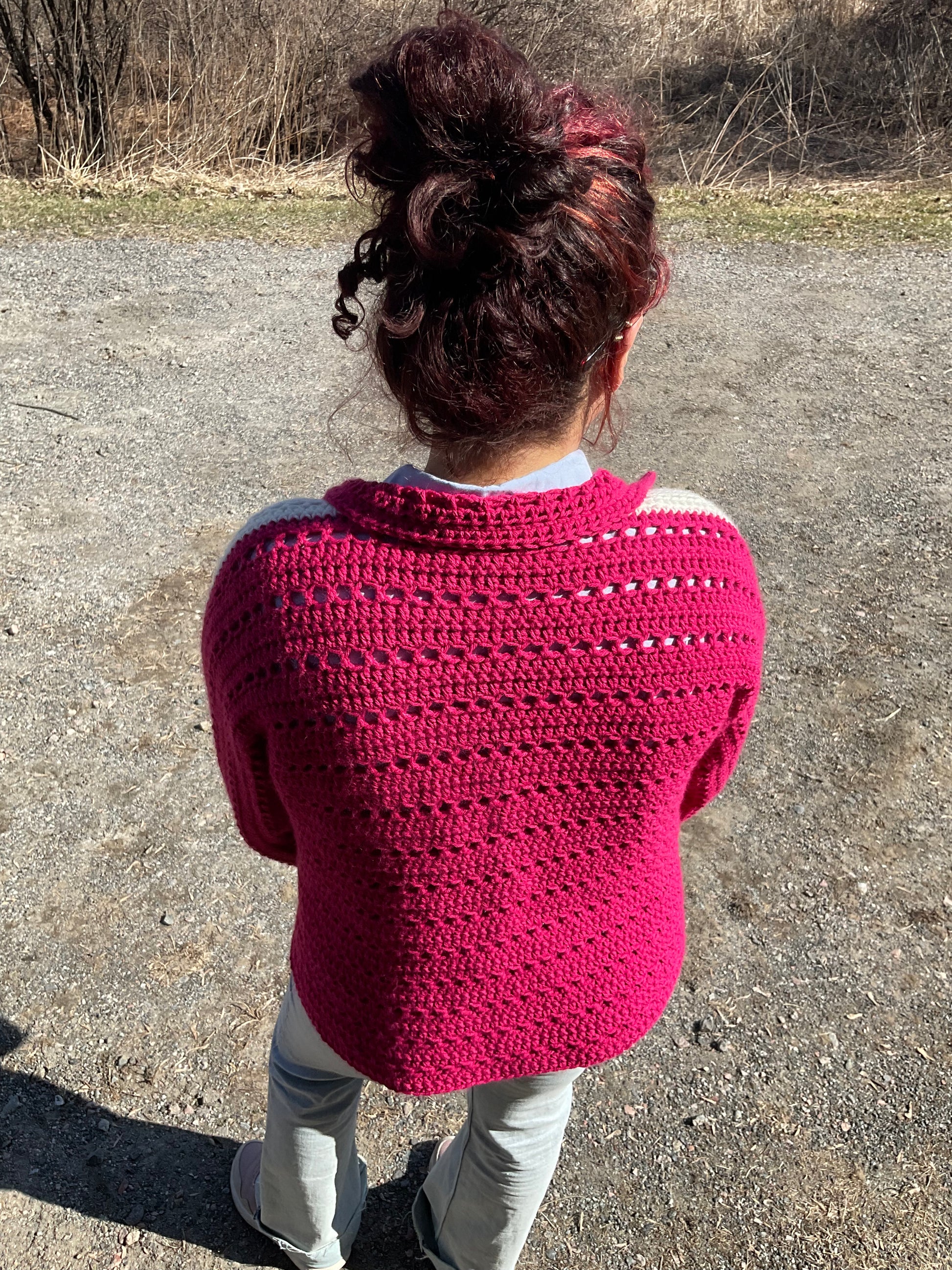 Darwin Cardigan: A fast, simple BOG-style cardigan worked in double crochet and finished with reverse single crochet for elegant edges.