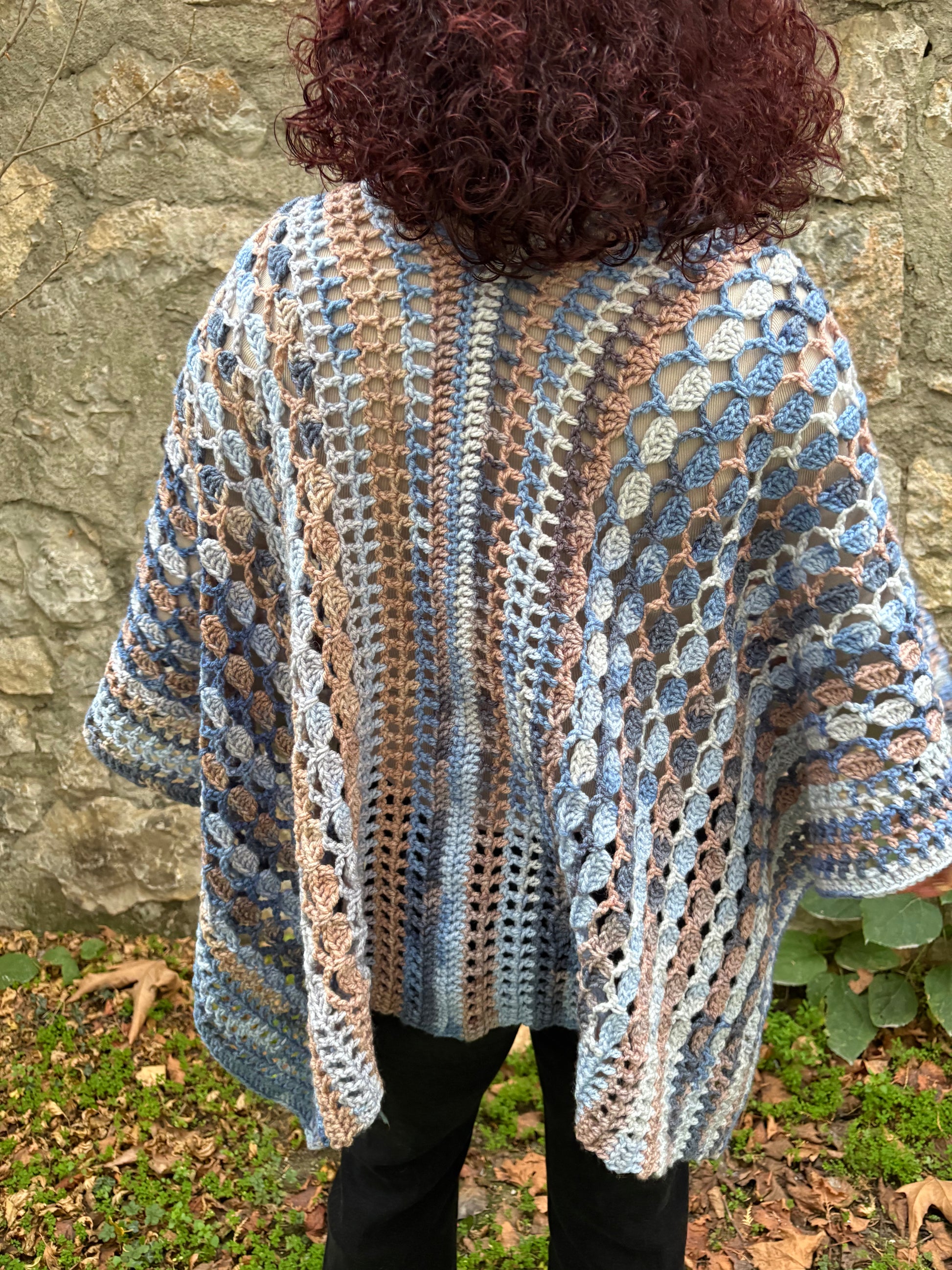 The Lovelace Poncho is a versatile poncho–shawl hybrid featuring elegant filet sections and textured leaf motif clusters. Designed with a row-based construction, it creates a flowing drape and beautiful visual shaping without complex techniques. This pattern is perfect for crocheters ready to move beyond simple garments and explore decorative stitch combinations while still enjoying clear guidance and customization options.